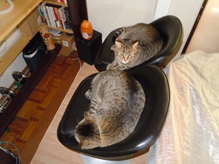 なんじゃい、この暑さはッ?! 絶対おかしい! エアコンを付けないと過ごせねぇぞ。 ところが猫は反クーラー派。 部屋の中でも、極力室温の高い場所を探して寝ております。 うちの中で、一番暑い場所でタスケとトスケがのんび~り ↑ ちょうど椅子も二つあり、それぞれのベッドみたい。